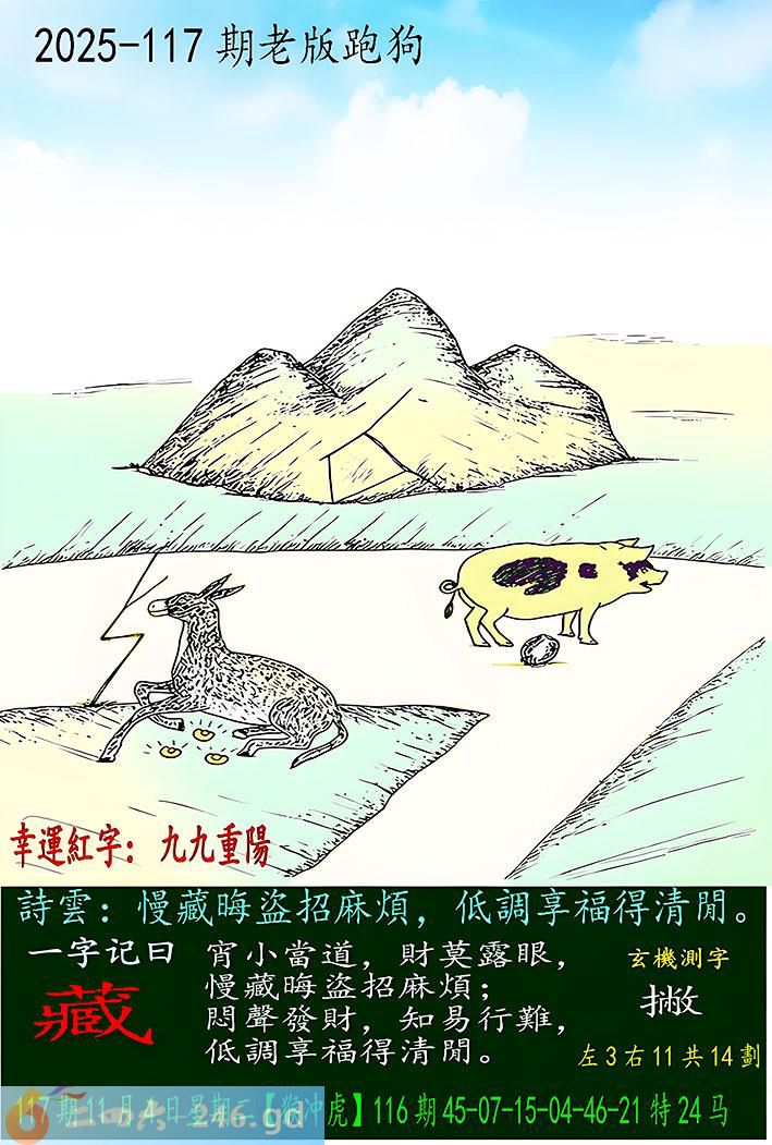 117期老版跑狗一字记之曰:【藏】 诗云:慢藏晦盗招麻烦,低调享福得清闲。 宵小当道,财莫露眼,慢藏晦盗招麻烦; 闷声发财,知易行难,低调享福得清闲。 是大意露财?高调炫富?