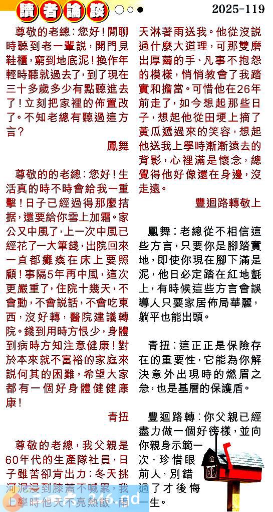 3.尊敬的老總,我父親是60年代的生產隊社員,日子雖苦卻肯出力:冬天挑河泥浸到膝蓋不喊累,我上學時他天不亮熱飯、雨天淋著雨送我。他從沒說過什麼大道理,可那雙磨出厚繭的手、凡事不抱怨的模樣,悄悄教會了我踏實和擔當。可惜他在26年前走了,如今想起那些日子,想起他從田埂上摘了黃瓜遞過來的笑容,想起他送我上學時漸漸遠去的背影,心裡滿是懷念,總覺得他好像還在身邊,沒走遠。豐迴路轉敬上