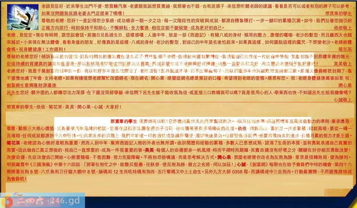 第052期《六合皇信箱文字版》10000%正確!!!正版二四六論壇*精心製作!!! 想買車的學生、依依、菊花茶、美美、開心果、心誠,大家好! 【1】.老師見信好,近來學生出門不便,想賈輛汽車,老婆跟我說想買奧迪我想著也不錯,也有派頭子,來信想听聽老師的建議,看看是否可以或者有別的牌子可以參考,如果沒問題我就跟老婆去門店提車了嘿嘿!想買車的學生 〖想買車的學生〗:買奥迪可以啊!它是德國最悠久的汽車製造商之一,以高技術水準、高品質標準及高強勁動力的準則,秉承進取,尊貴,動感三大核心價值,成為豪華汽車品牌的標誌。它現在是福斯集團全資的子公司,被收購後更有多項精確的改進。 【2】.尊敬的老總,您好!一直記得您分享過,成功絕非一朝夕之功,每一次階段性的突破與成就,都源自穩紮穩打、一步一腳印的累積沉澱。如今,我們沿著您指引的正確方向前行,時刻保持平和耐心,不懈耕耘、全力奮進,相信定能不斷蜕變,成為更好的自己。依依敬上 〖依依〗:跨越高山,靠的是一步步累積;砌起高塔,要從-磚一瓦堆砌,任何成就都源於平凡中堅持。在追求進步的道路上,我們常常被一時的激情或急躁所驅使,渴望快速見效。但經驗告訴我們,想要實現持久的進步,旧楼月累的努力才是王道。 【3】.老總,見信安。現在有時間,跟您說會話。前幾日兄長過生日,這樣感嘆:人進中年,就是一部《西遊記》,有豬八戒的身材,猴哥的壓力,唐僧的囉嗦,老沙的髪型,而且離西天也越來越近。小弟現在無法體會,看看身邊的朋友,好像真的是這樣,八戒的身材,老沙的髪型,對自己的中年莫名後怕起來。如果真這樣,如何擺脱這樣的魔咒,不想變老沙。老總能體會嗎。祝身體健康!工作順利!菊花茶 〖菊花茶〗:老總認為心態好是較為重要,然而人到中年,集齊西遊記人物的外表也無所謂。由於閱歷和經驗的累積,多數人已思想成熟,認清了生命的本質,並有勇氣表達自己真實的需要。因此做自己真正想做的,找自己一直想要的,成為一件很重要的事。 【4】.尊敬的老總您好!傾訴我最近的苦惱,這段時間我的建氣實在是太差了,買什麼都不中獎,仿佛被微運緊緊纏住。我感覺自己就像在一片迷霧中徘徊,怎麼都找不到那縷幸運的陽光,但這持績的背運真的讓我有些沮喪。所以我特別希望能從您著裡沾沾喜氣,真誠渴望在接下來能夠好運連連,收穫建一些警喜和美好,再次懇請老總賜予我好運吧!美美敬上 〖美美〗:每個人的命運都非一帆風順,時而平順時而顛簸,其實命運沒有好壞之分,關鍵在於你能否勇敢改變!改變命運,先從改變自己開始。心態要積極,不畏困難,努力克服障礙。不將抱怨掛嘴邊,而是思考解決方式。 【5】.老總您好,我是千萬創富會員中的一員,我以有好多年沒去信間安了,老總莫怪!因為我沒才華,寫不出華麗句子,所以那磨多年也只能默默支持創富網。前袋天會員帳號到期了,毫不猶豫地續了年會,支持老總。如果有緣很想老總幫忙改個網名,現在網名:開心果,感覺這網名總是黑莊的口糧,希望得到老總的垂憐。感恩有您。祝:老總身體健康萬事如意祝:創富網生意興隆財源廣進開心果 〖開心果〗:那麼老總替你改名為反敗為勝,意思是扭轉敗局,變為勝利。明朝羅貫中《三國演義》中第十六回說:「將軍在匆忙之中,能整兵堅壘,任飫勞,使反敗為勝,雖古之名將,何以加茲!」 【6】.吕先生您好,聽外面的人都傳您功力深厚,在下還沒拜師學藝,來信問下呂先生能不能收我為徒,或直接三口教精我可以嗎?我是很用心的人,學東西也快,不知道呂先生給我機會嗎?心誠敬上 〖心誠〗:《創富網》每期也在給予會員們中特的機會,第四十六期開重肖狗8號,八爪魚和刀仔鋸大橱中8號、論碼和12生肖吼特碼有狗肖、五行奪碼又中土土自生。另外九方大師0358尾、而講碼佬中三合狗肖。行動最實際,不用猶豫趕快成為會員吧! 紅字:匿影藏形 暗码:09132941 [释义]隐藏形迹,不露真相。也比喻躲藏起来,不公开活动。 [出处]《邓析子·无厚篇》:“为君者,藏形匿影,群下无私,掩目塞耳,万民恐震。”