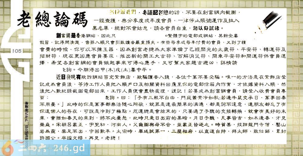 105期:六合皇金句/老总论码/萧公子/林大师/五行夺码/老总信箱截图