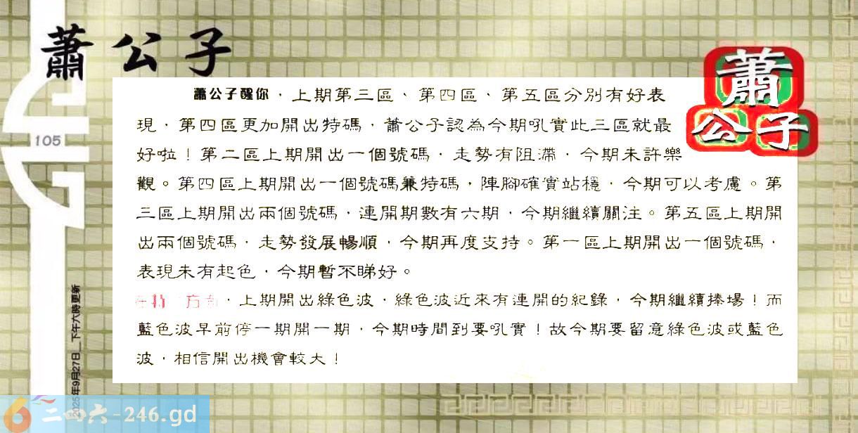 2025105期105期:彩民推荐六合皇信箱(紅字:望塵拜伏)
