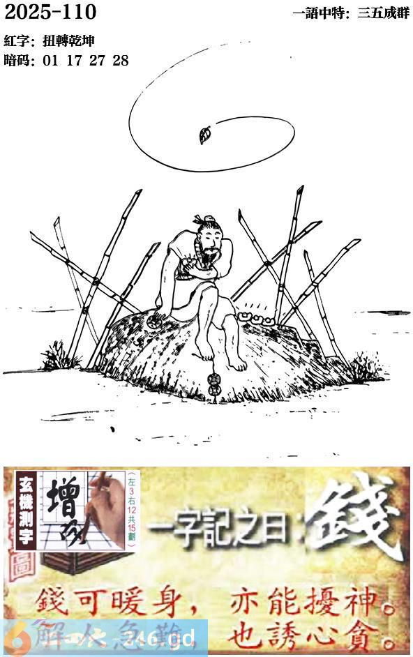 110期跑狗一字記之曰:【錢】 錢可暖身,亦能擾神。 解人急難,也誘心貪。 玄機測字:《增》 一語中特:三五成群