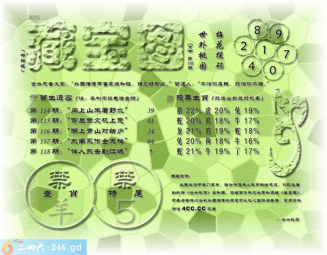 118期藏寶圖 新:苏小门前万缕垂 老:伴人东去到江城 禁:羊禁:5尾玄機字:《存》