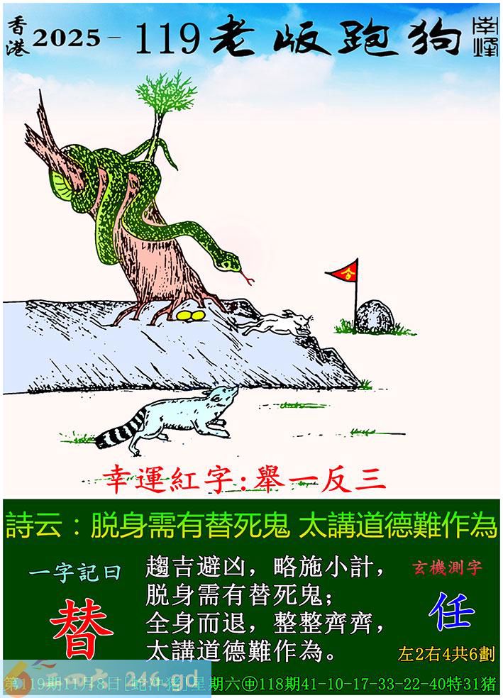 119期老版跑狗一字記之曰:【替】 詩雲:脱身需有替死鬼,太講道德難作為。