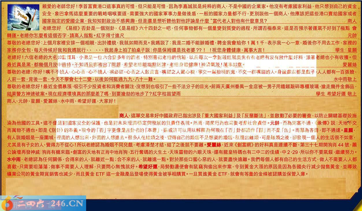【4】.老總好!六信老總的大名如雷貫耳,小弟是一位六合皇多年的讀者,特別喜歡老總的信箱,以前每一次拿到報紙就要先看看老總有沒有放什麼好料,跟著老總也小有收獲。但最近真是黑,都幾個月沒中過特。不知道是那裡出了問題,希望老總能指點迷律。老總身體健康!神清氣茂!萬事如意。愛麗絲